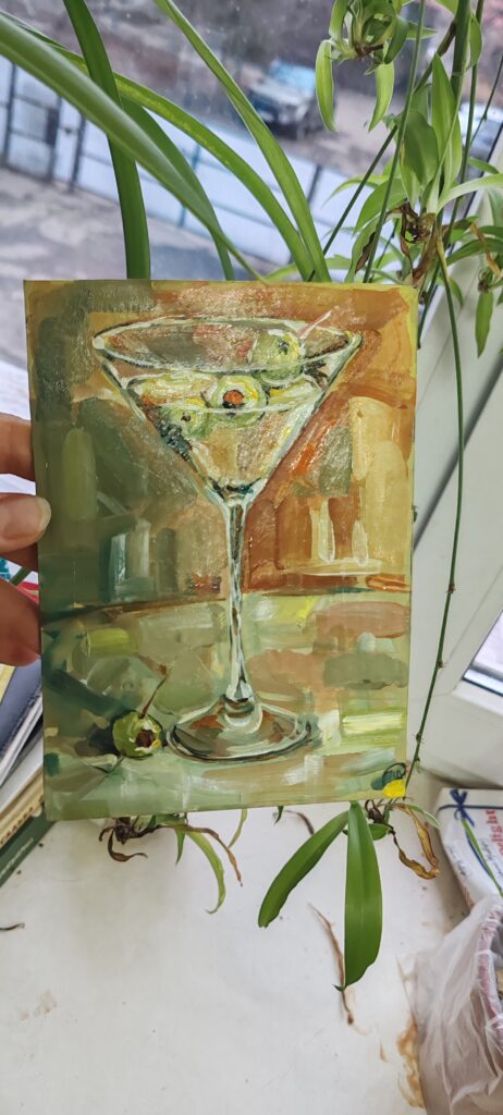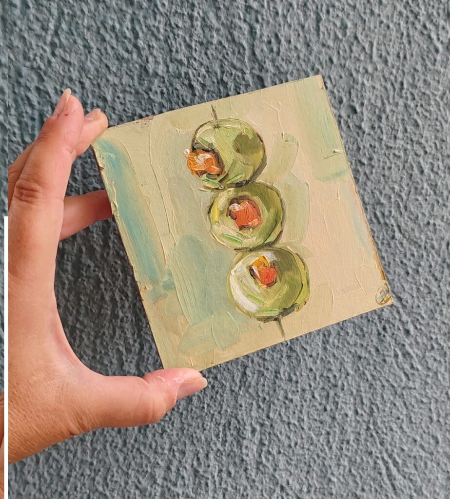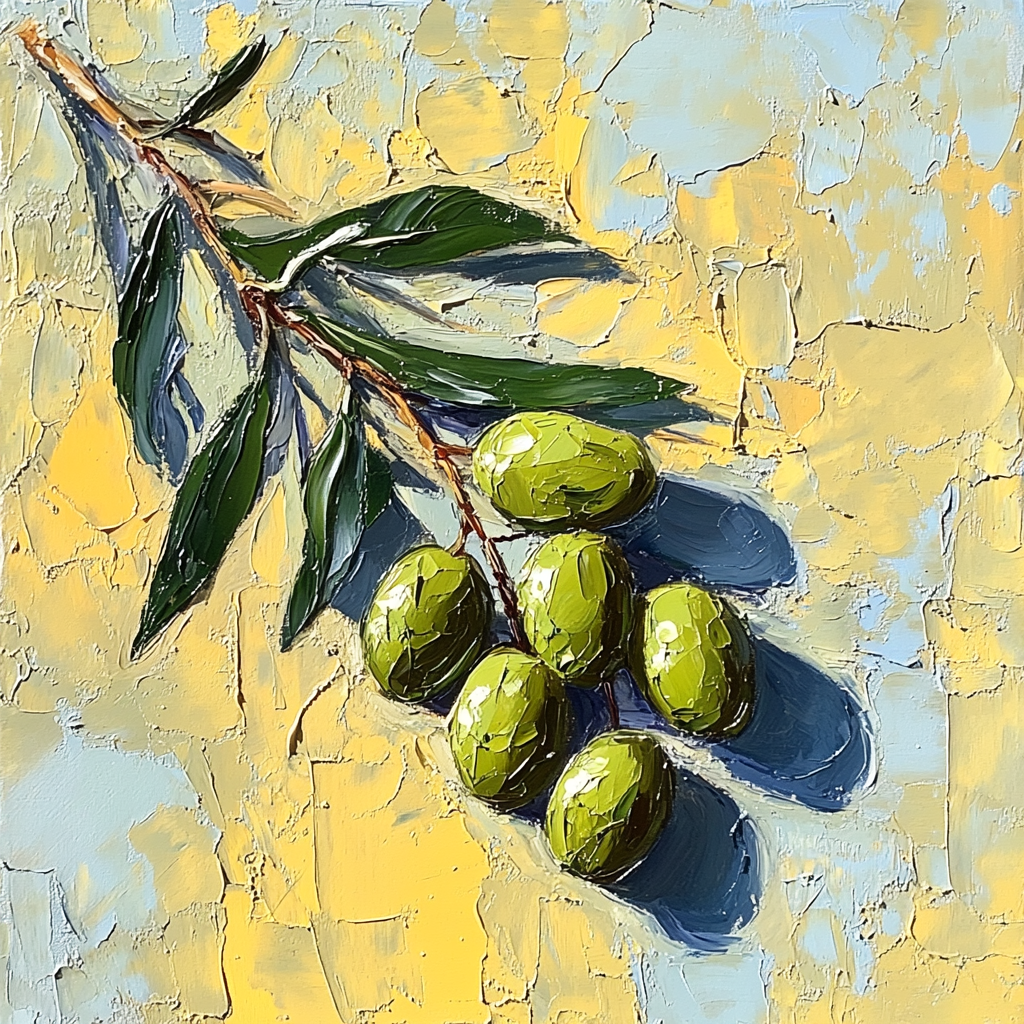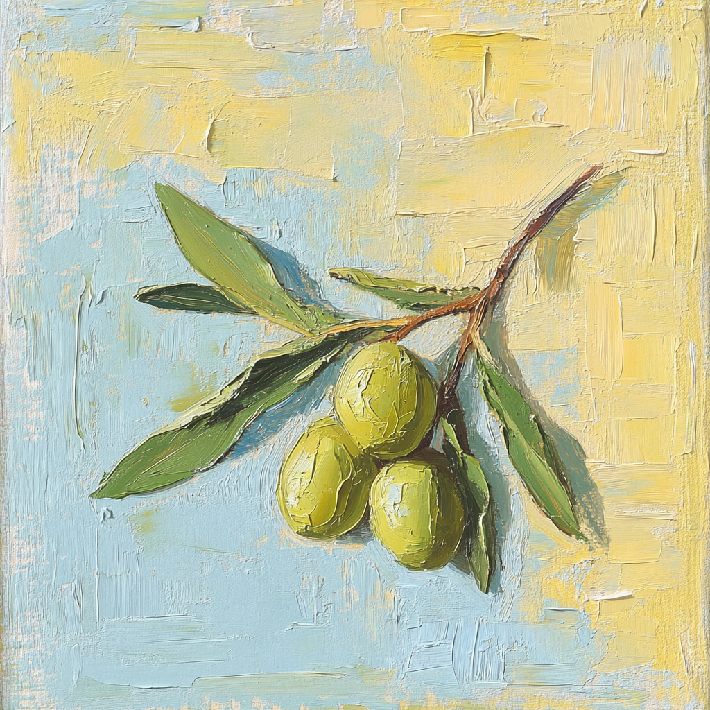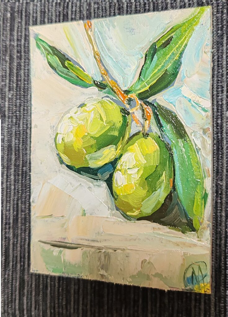 Olives feel familiar, yet elegant — especially when painted in oil with visible texture.