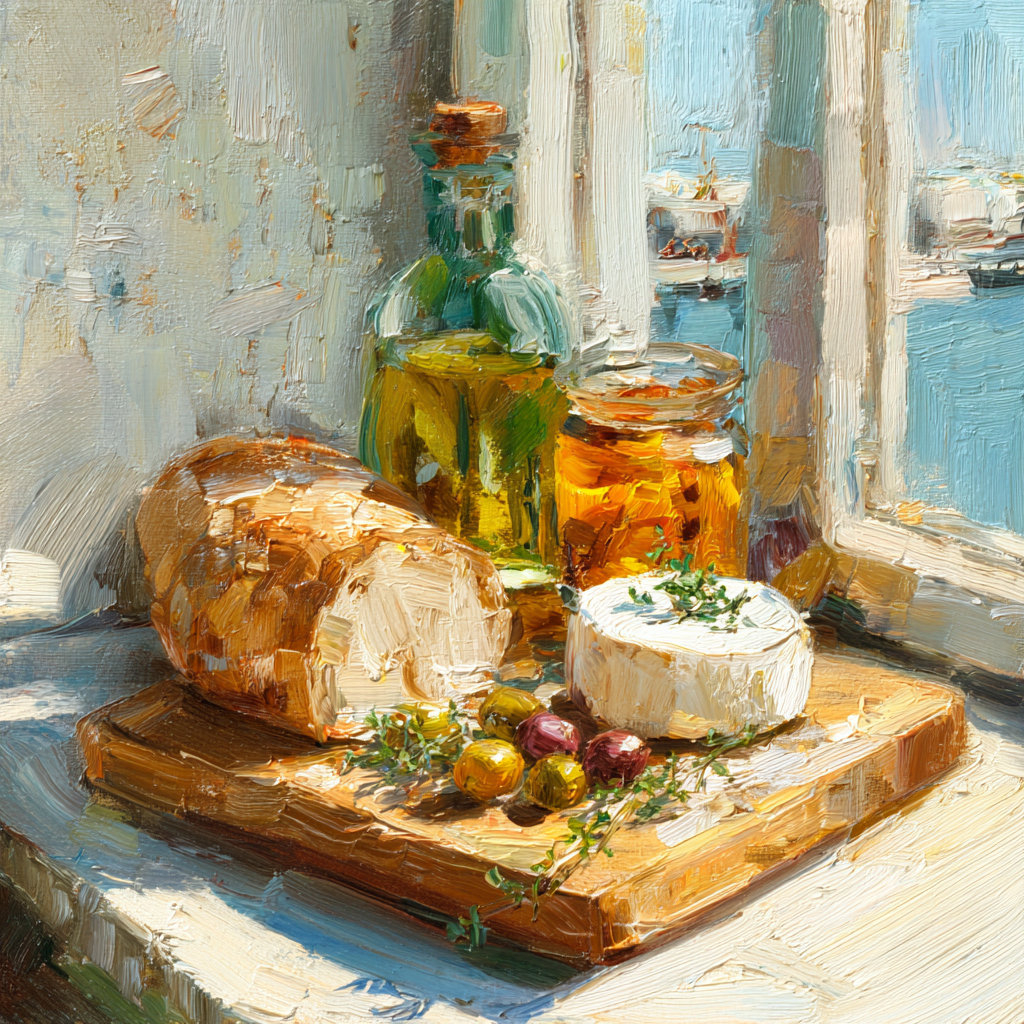An olive painting suggests a way of living: sunlight, warmth, simplicity, good food, and time to breathe.
